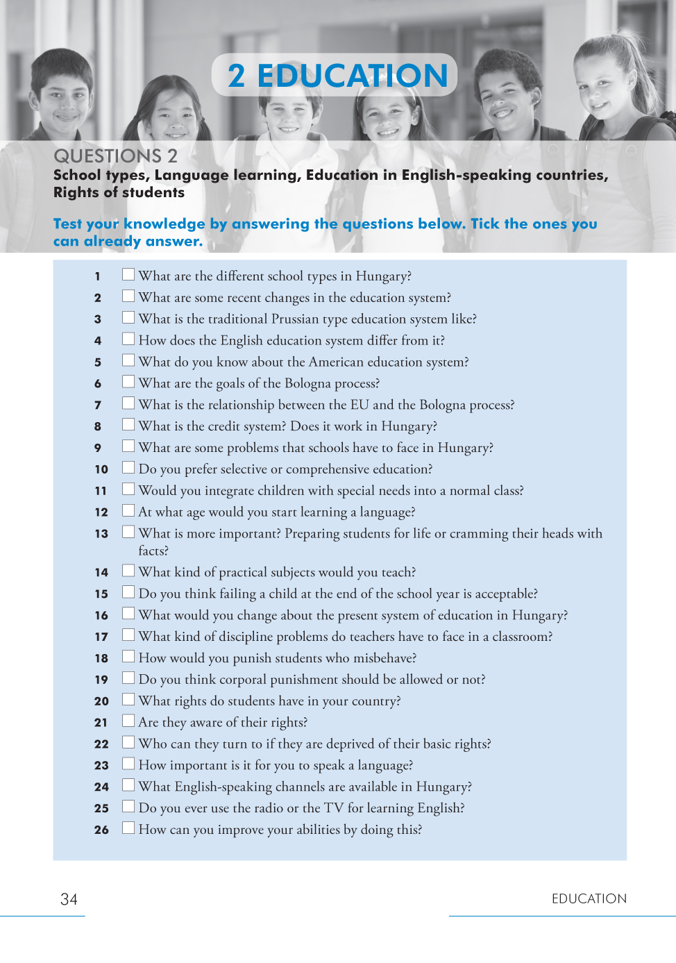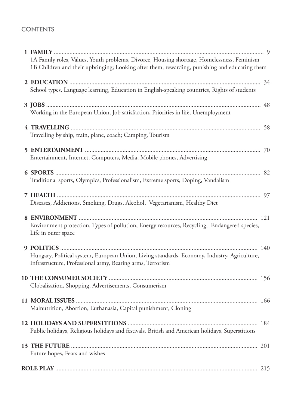 A könyvben található 13 fejezet a Magyarországon államilag elismert felsÅ‘fokú vizsgák és az emelt szintű érettségi témaköreit dolgozza fel. Az egyes kérdéseket mintaválasz követi - gyakran egyszerre több is -, valamint az adott kérdéshez és válaszhoz kapcsolódó szó- és kifejezés-gyűjtemény, ami mentesÃti a nyelvtanulót a hosszadalmas szótárazás alól.