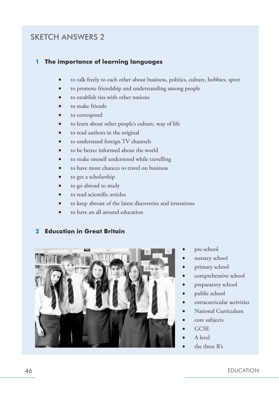 A fejezetek végén témavázlat (Sketch Answers) található a legfontosabb témák és a velük kapcsolatos jelenségek és kifejezések felsorolásával, hogy az adott témakört önállóan, árnyaltabban és személyre szabottabban dolgozhassuk fel.