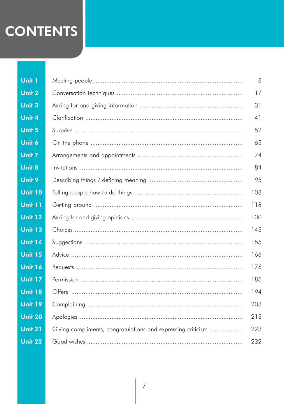 A 22 fejezet a mindennapi élet magánjellegű és hivatalos beszédhelyzeteit jelenÃti meg, mégpedig elsÅ‘sorban párbeszédet tartalmazó, szituációs feladatok formájában. A könyv bemutatja, hogyan mutatkozzunk be, kérjünk információt, fejezzük ki sajnálatunkat, vagy éppen tegyünk panaszt különbözÅ‘ esetekben. FejezetrÅ‘l-fejezetre haladva, mindössze 22 lépésben egy jól használható nyelvtudásra tehetünk Ãgy szert, melynek birtokában képesek leszünk szabatosan és hatékonyan kifejezni magunkat az utcán, üzletben, iskolában, munkahelyen, hivatalban - bármely helyszÃnen és élethelyzetben.