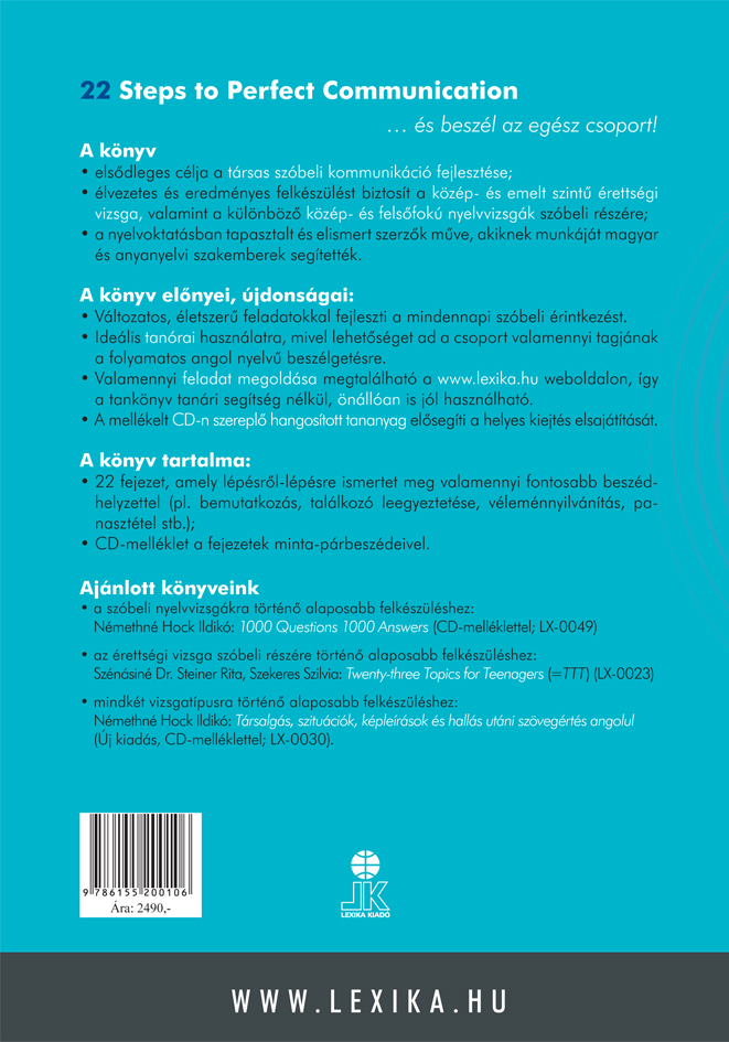 Mindig, minden helyzetben megtalálni a helyes és hatásos szavakat... - ez bizony nem könnyű feladat. ÉrthetÅ‘, hogy ez a cél lebeg szinte minden nyelvtanuló szemei elÅ‘tt, s ez a talán legelemibb nyelvhasználói igény hÃvta életre ezt a könyvet is. A 22 Steps to Perfect Communication programjának középpontjában a társas szóbeli kommunikáció fejlesztése áll. Minthogy mind a közép- és felsÅ‘fokú nyelvvizsgák, mind a közép- és emelt szintű érettségi vizsga szóbeli része tartalmaz ún. szituációs feladatokat, jelen kiadvány ezen vizsgák sikeres letételéhez is segÃtséget kÃván nyújtani. A könyvben megjelenÅ‘ témakörök azonosak az emlÃtett vizsgák elÅ‘Ãrt témaköreivel.