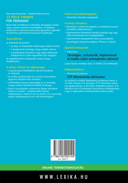 Könyvünk a hatékony és élvezetes társalgásra tanÃtja meg a német nyelvvel ismerkedÅ‘ket. A kiadvány elsÅ‘sorban a tizenéves korosztály igényeihez igazodik, de bármely nyelvtanuló haszonnal forgathatja.