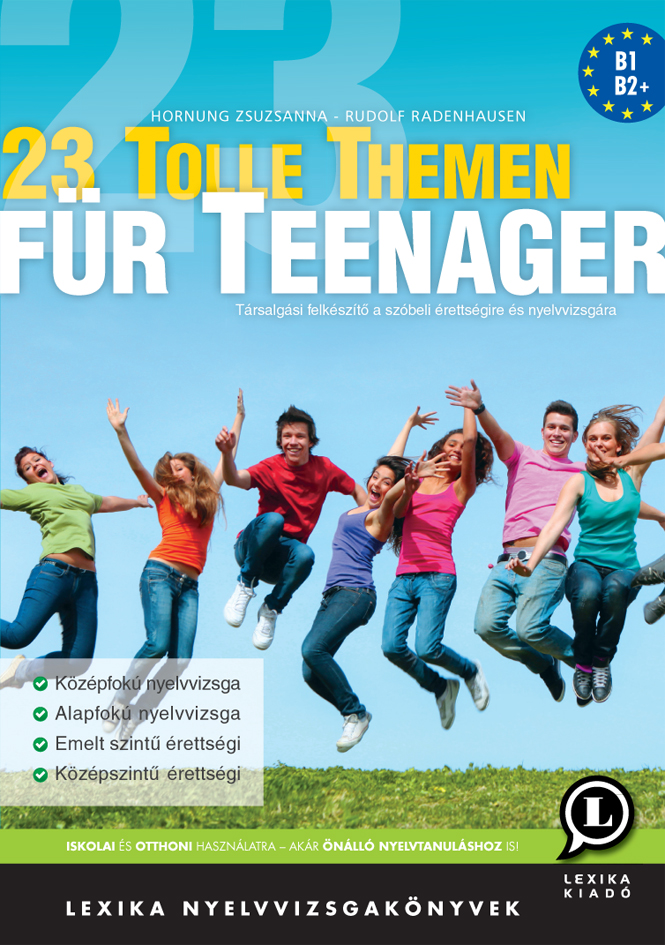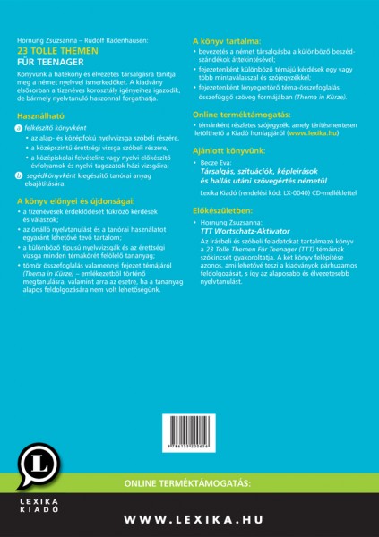 • Hornung Zsuzsanna: "TTT Wortschatz-Aktivator" (várható megjelenés: 2017) Az Ãrásbeli és szóbeli feladatokat tartalmazó könyv a "23 Tolle Themen Für Teenager" (TTT) témáinak szókincsét gyakoroltatja. A két könyv felépÃtése azonos, ami lehetÅ‘vé teszi a kiadványok párhuzamos feldolgozását, s Ãgy az alaposabb és élvezetesebb nyelvtanulást.