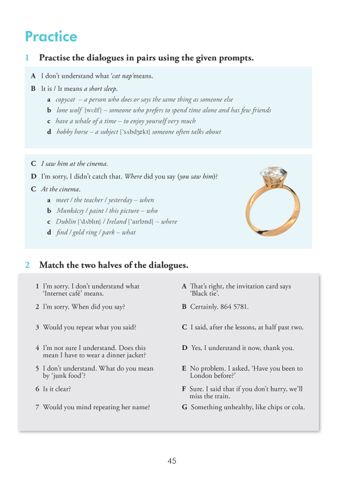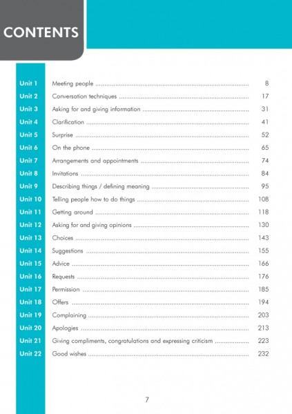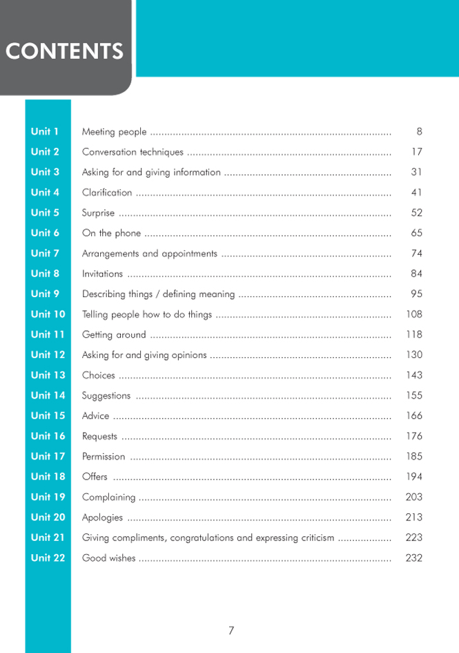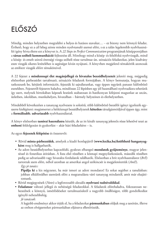 • 22 fejezet, amely lépésrÅ‘l-lépésre ismertet meg valamennyi fontosabb beszédhelyzettel (pl. bemutatkozás, találkozó leegyeztetése, véleménnyilvánÃtás, panasztétel stb.);