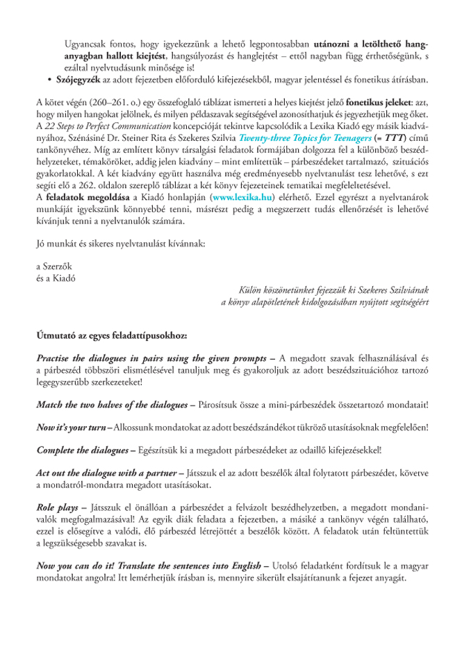 • az érettségi vizsga szóbeli részére történő alaposabb felkészüléshez: Szénásiné Steiner Rita, Szekeres Szilvia: Twenty-three Topics for Teenagers (2. kiadás, Lexika Kiadó 2016; rendelési kód: LX-0150-2)