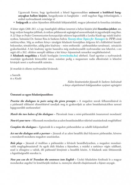 A könyv elsÅ‘dleges célja a társas ill. csoportos szóbeli kommunikáció fejlesztése. Élvezetes és eredményes felkészülést biztosÃt a közép- és emelt szintű érettségi vizsga, valamint a közép- és felsÅ‘fokú nyelvvizsgák szóbeli részére.