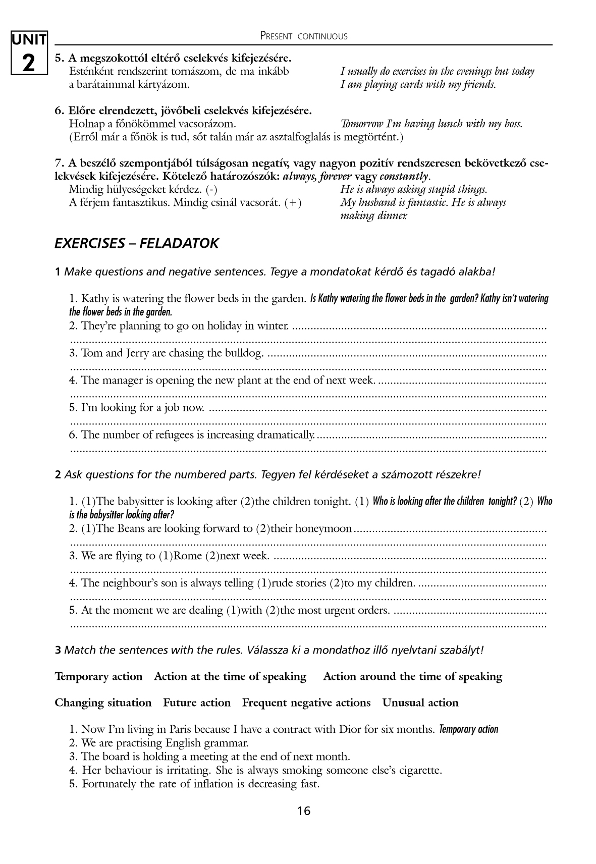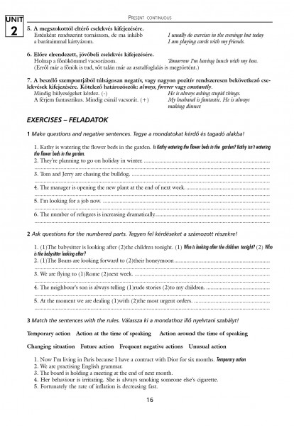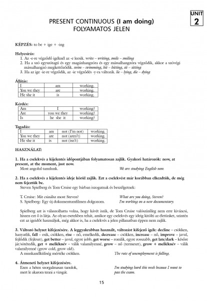 Referencia anyagként és gyakorló könyvként egyaránt megállja a helyét. KellÅ‘ alapossággal foglalkozik azokkal a nyelvtani egységekkel, amelyek a középszintű nyelvtudással rendelkezÅ‘ tanulóknak a legtöbb gondot okozzák. A magyar nyelvben összefoglalt nyelvtani szabályokat minden esetben példamondatok illusztrálják. A bemutatott nyelvtani egységet változatos feladatok és fordÃtási gyakorlatok követik.