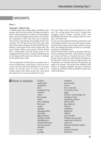 RendkÃvül hatékony segÃtség a gazdasági szaknyelvi vizsgák hallás utáni szövegértés tesztjeihez. Önállóan is használható a saját ritmus szerinti készségfejlesztésben, az eredményes nyelvtanulásban. B2/C1