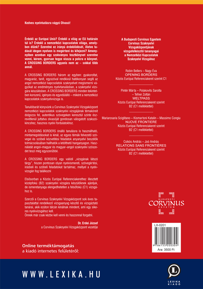 Érdekli az Európai Unió? Érdekli a világ az EU határain túl is? Érdekli a nemzetközi kapcsolatok világa, amelyben élünk? Szeretné ez irányú érdeklődését, illetve tudását idegen nyelven is megérteni és kifejezni? Amennyiben azonban egy szokványos tesztkönyvet szeretne venni, kérem, gyorsan tegye vissza a polcra e könyvet. A CROSSING BORDERS ugyanis nem az - sokkal több annál.