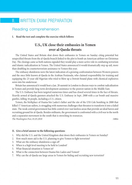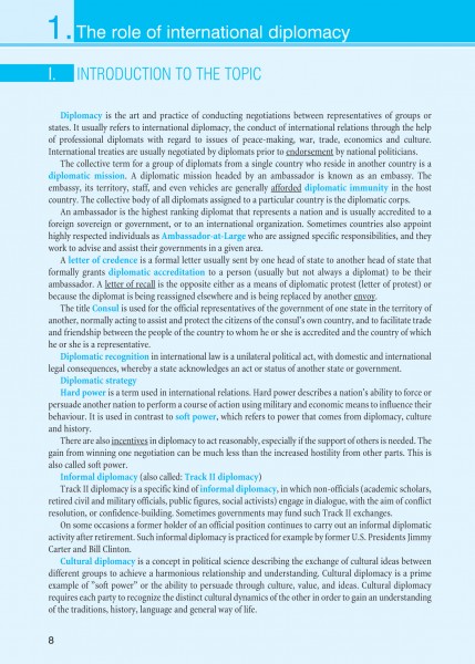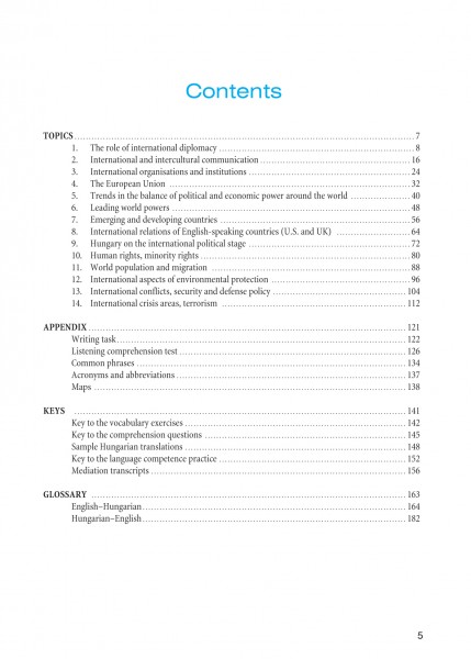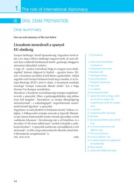Tanulóbarát könyvünk a Corvinus Szaknyelvi Vizsgaközpont nemzetközi kapcsolatok szaknyelvi vizsgájának témaköreit dolgozza fel, autentikus szövegeken keresztül szinte észrevétlenül juttatva olvasóját gondosan válogatott szakszókincshez, hasznos nyelvi fordulatokhoz.