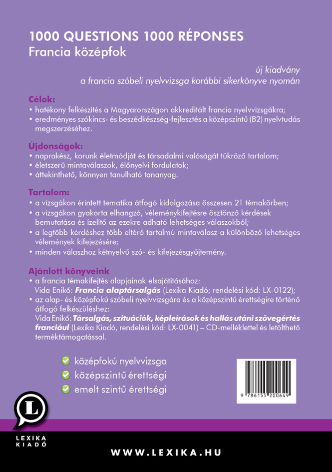 A 1000 Questions 1000 Réponses. Francia középfok egy új kiadvány a több nyelven, s köztük franciául is népszerű tankönyvsorozatban. A korábbi, azonos fÅ‘cÃmű ("1000 Questions 1000 Réponses"), közép- és felsÅ‘fokú tananyagot egyaránt tartalmazó kiadvány helyébe jelen könyvünkkel egy kifejezetten középfokú nyelvi szintű tankönyv lép, amelyet egy felsÅ‘fokú kiadvány ("1000 Questions 1000 Réponses. Francia felsÅ‘fok") is követ majd. Új, tartalmilag és külsejében egyaránt korszerű tankönyvünk