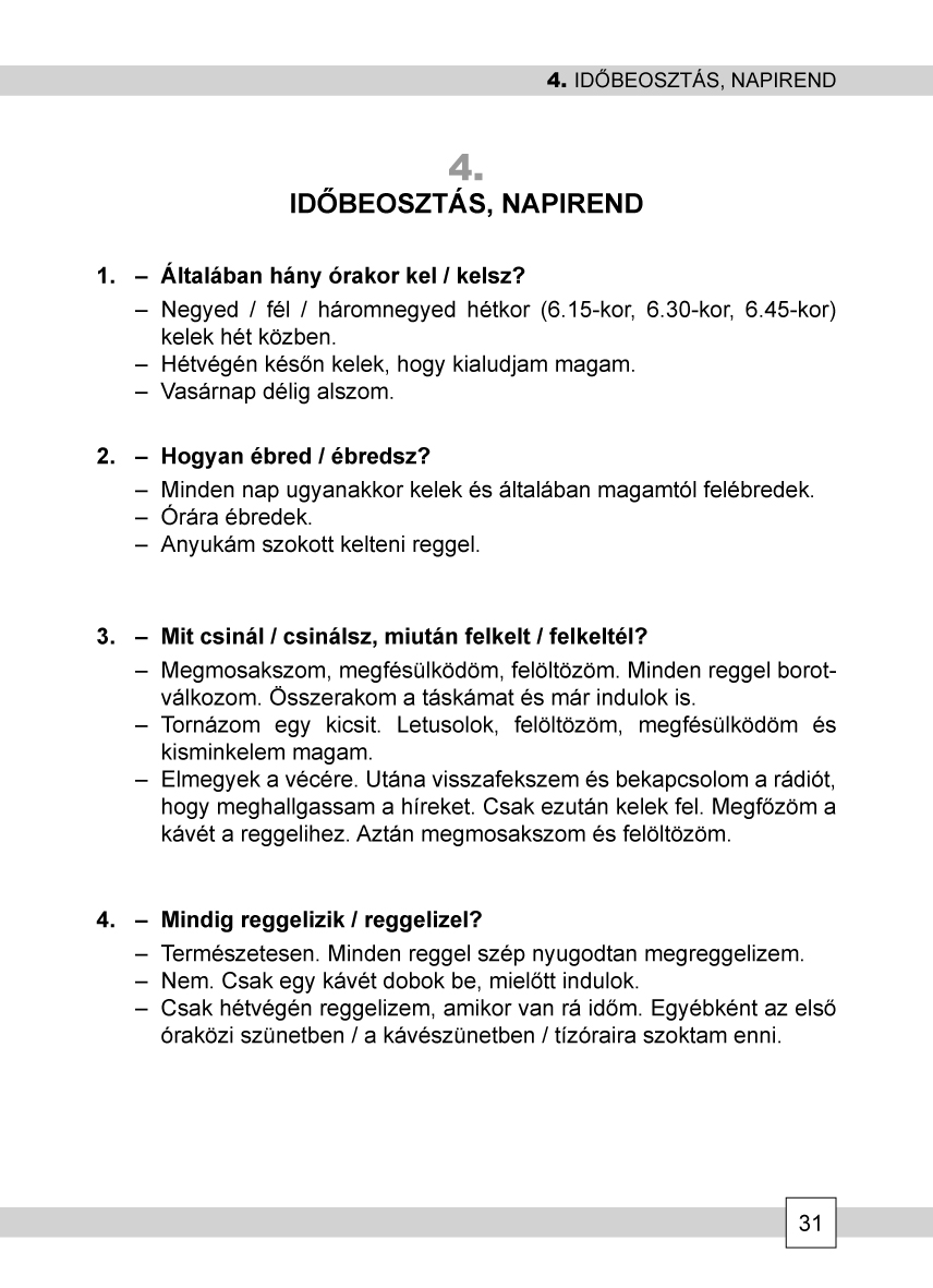 A mindennapi életben leggyakrabban elÅ‘forduló témák egyszerű nyelvezettel történÅ‘ kifejtésével, tükörfordÃtásos szerkezetben a könyv lehetÅ‘séget nyújt rövid idÅ‘ alatt használható nyelvtudás elsajátÃtásához.