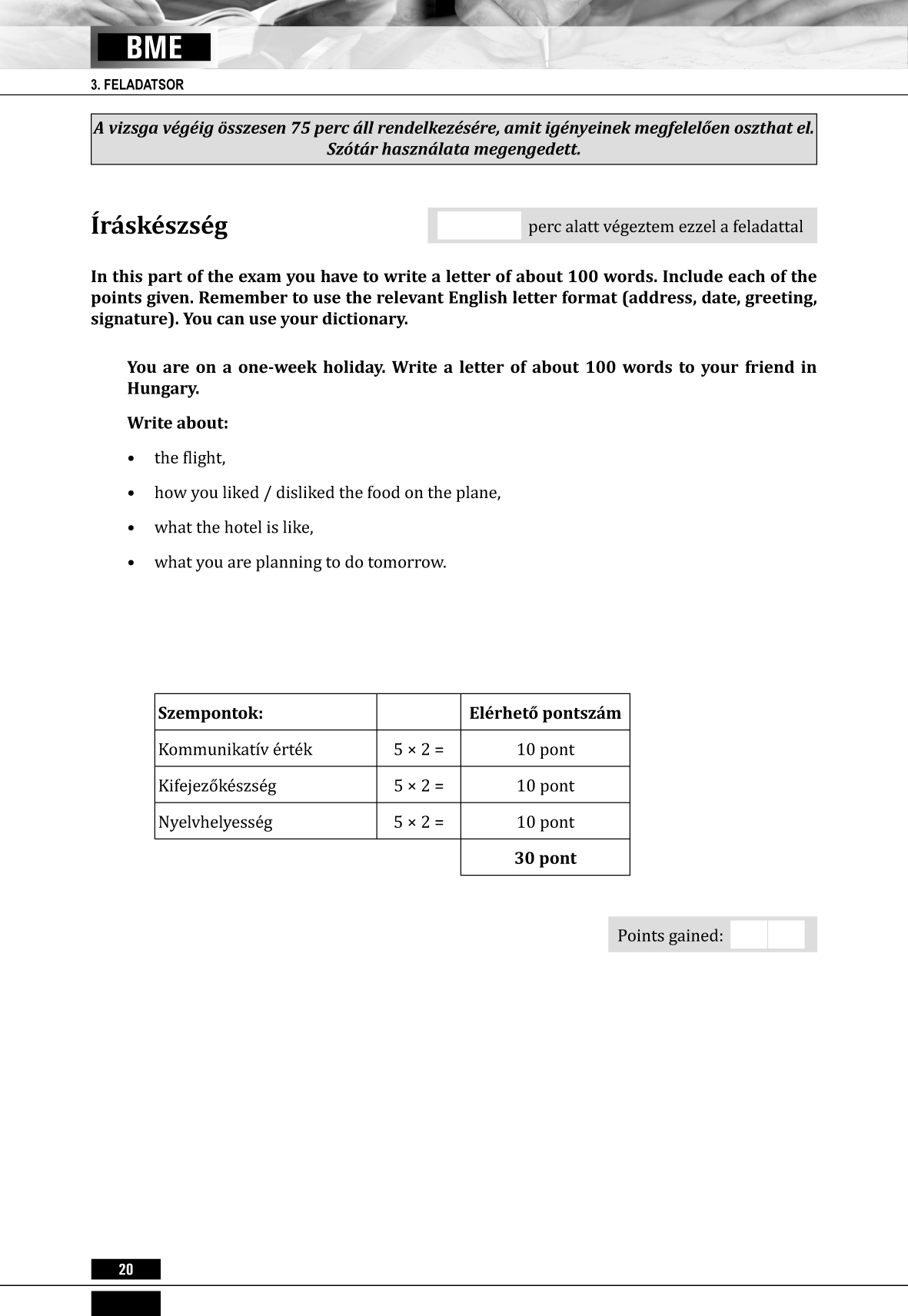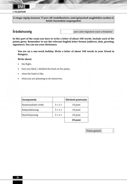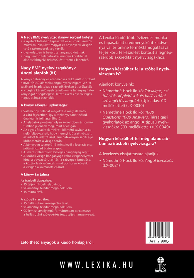 SzövegértéstÅ‘l a mintalevélig…. Biztos út a BME tÃpusú alapfokú angol nyelvvizsga letételéhez, akár önálló használattal. A könyv hatékonyságát a segÃtségével letett sikeres nyelvvizsgák magas aránya bizonyÃtja. CD melléklettel.