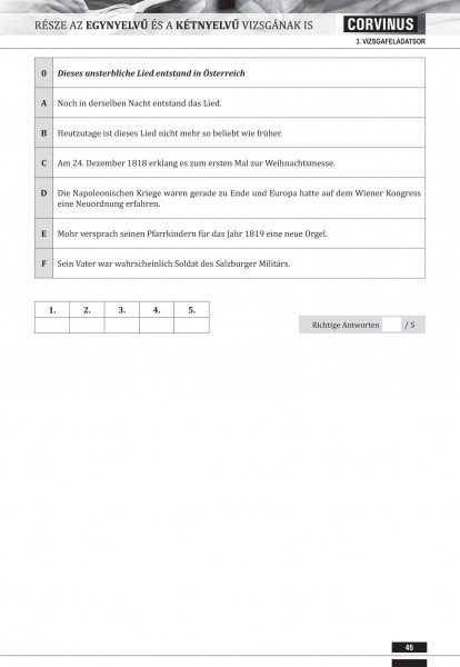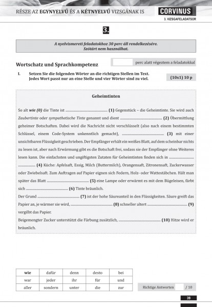 A könyv hatékony és eredményes felkészülést biztosÃt német nyelvbõl a középfokú Corvinus Ãltalános Nyelvvizsgára. Az itt található feladatokat a szerzõk vizsgára készülõ nyelvtanulókkal szerzett tapasztalataik alapján fejlesztették ki; a tananyag hatékonyságát a segÃtségével letett eredményes nyelvvizsgák magas aránya is igazolja.