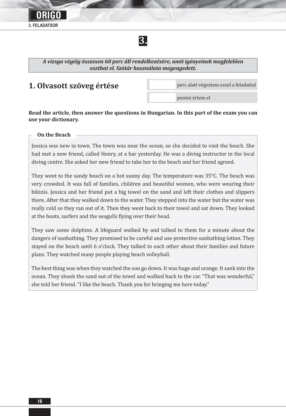 • a szóbeli vizsga hanganyaga valós vizsgahelyzetet idéz: a bevezetÅ‘ utasÃtás, a szövegek ismétlése, a köztük levÅ‘ szünetek mind pontosan követik a vizsgán alkalmazott eljárást.