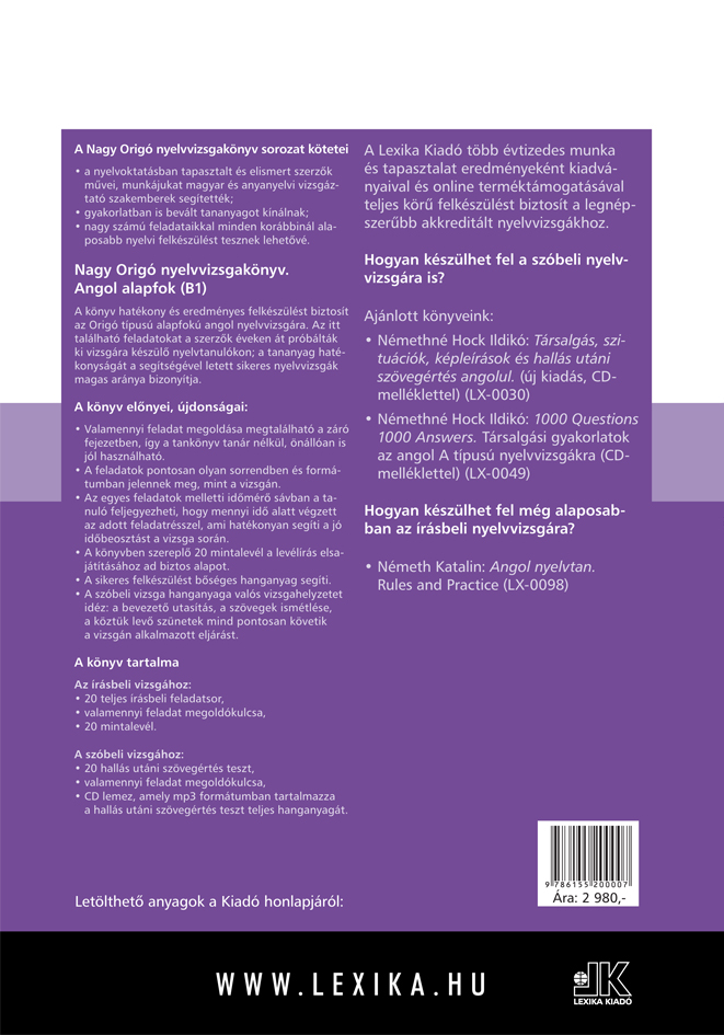 A könyv hatékony és eredményes felkészülést biztosÃt az ORIGÓ tÃpusú alapfokú angol nyelvvizsgára. Az itt található feladatokat a szerzÅ‘k éveken át próbálták ki vizsgára készülÅ‘ nyelvtanulókon; a tananyag hatékonyságát a segÃtségével letett sikeres nyelvvizsgák magas aránya bizonyÃtja.