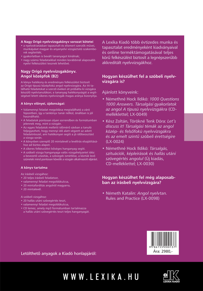 A könyv hatékony és eredményes felkészülést biztosÃt az Origó tÃpusú középfokú angol nyelvvizsgára. Az itt található feladatokat a szerzÅ‘ éveken át próbálta ki vizsgára készülÅ‘ nyelvtanulókon; a tananyag hatékonyságát a segÃtségével letett sikeres nyelvvizsgák magas aránya bizonyÃtja.