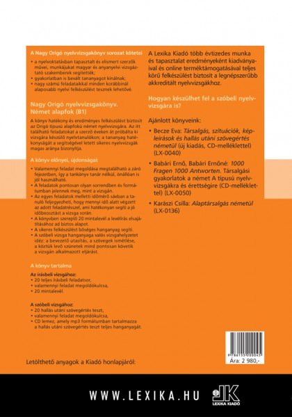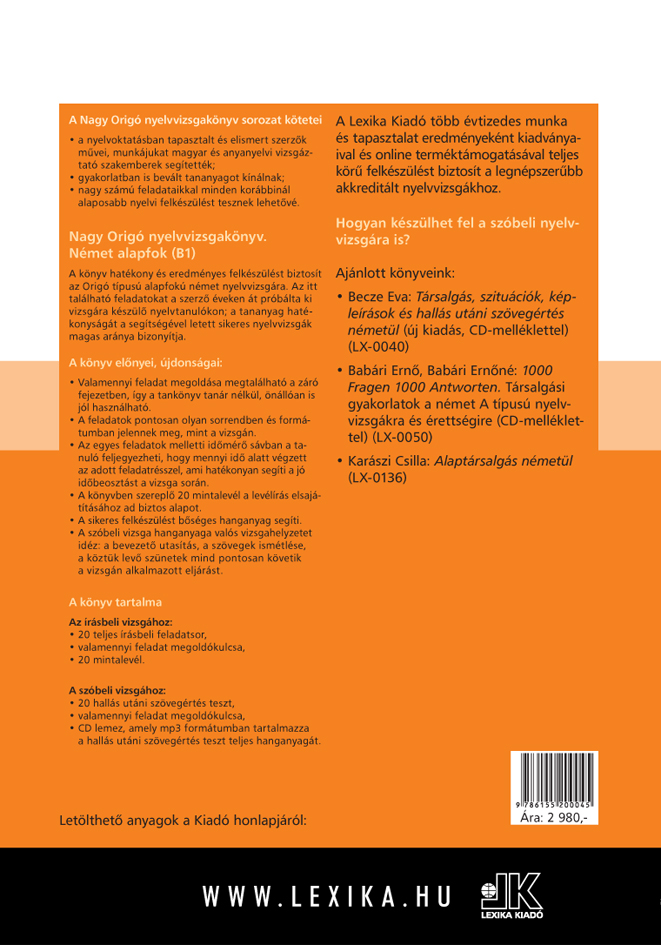 A könyv hatékony és eredményes felkészülést biztosÃt a ORIGÓ tÃpusú alapfokú német nyelvvizsgára. Az itt található feladatokat a szerzÅ‘ éveken át próbálta ki vizsgára készülÅ‘ nyelvtanulókon; a tananyag hatékonyságát a segÃtségével letett sikeres nyelvvizsgák magas aránya bizonyÃtja.