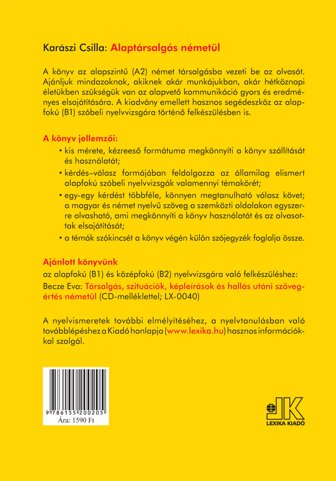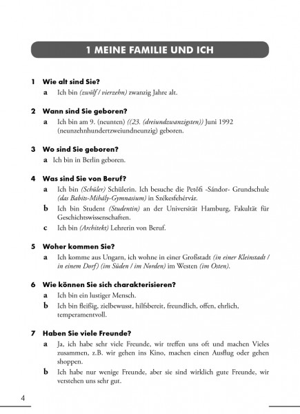 A könyv fejezetei az alapfokú (B1 szintű) nyelvvizsga témaköreit ölelik fel. Az olvasó az egyes témákon belül leggyakrabban elÅ‘forduló kérdéseket és az azokra adható válaszok gyűjteményét találja ebben a könyvben. A válaszminták természetesen csak iránymutatásként szolgálnak, a legtöbb esetben különbözÅ‘ lehetÅ‘ségeket felsorakoztatva, amelybÅ‘l a nyelvtanuló kiválaszthatja a számára legmegfelelÅ‘bbet, illetve azok alapján saját igényeinek, beszédszándékának megfelelÅ‘en más kifejezésekkel is helyettesÃtheti, kiegészÃtheti azokat.