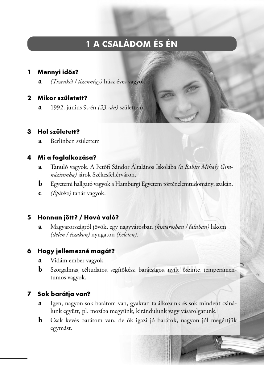 Mivel alapfokú nyelvvizsgát túlnyomórészt diákok tesznek, a válaszok megfogalmazásánál különös gondot fordÃtottunk az iskolai életbÅ‘l vett példákra, de természetesen felsÅ‘fokú tanulmányokat folytató illetve felnÅ‘tt nyelvtanulók is haszonnal forgathatják könyvünket. Az egyes témákon belüli egyszerű és gyors eligazodást segÃti, hogy a bal oldalon szereplÅ‘ kérdések és válaszok magyar megfelelÅ‘it a szemközti oldalon találja az olvasó. Könyvünk Ãgy egyfajta társalgási szótárként is használható.