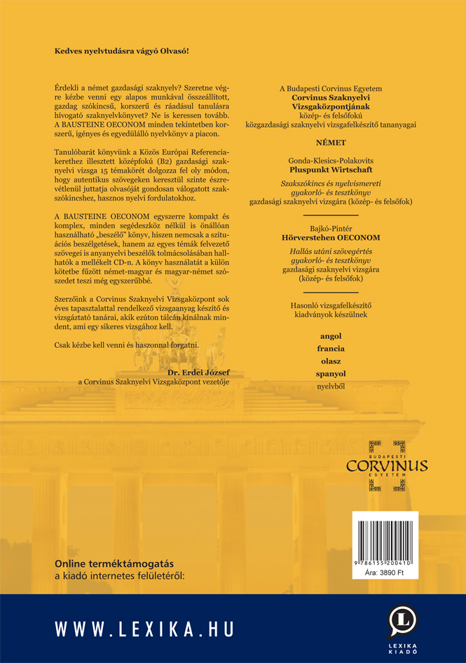 A BAUSTEINE OECONOM egyszerre kompakt és komplex, minden segédeszköz nélkül is önállóan használható "beszélő" könyv, hiszen nemcsak a szituációs beszélgetések, hanem az egyes témák felvezető szövegei is anyanyelvi beszélők tolmácsolásában hallhatók (letölthető mp3 formátumban). A könyv használatát a letölthető dokumentumként német-magyar és magyar-német szószedet teszi még