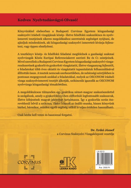 Könyvünkkel elsÅ‘sorban a Budapesti Corvinus Egyetem közgazdasági szaknyelvi Ãrásbeli vizsgájának közép- illetve felsÅ‘fokú szakszókincs és nyelvismereti tesztjeinek sikeres megoldásához szeretnénk segÃtséget nyújtani, de ajánljuk mindenkinek, aki közgazdasági szaknyelvi ismereteit kÃvánja fejleszteni, vagy éppen elmélyÃteni.