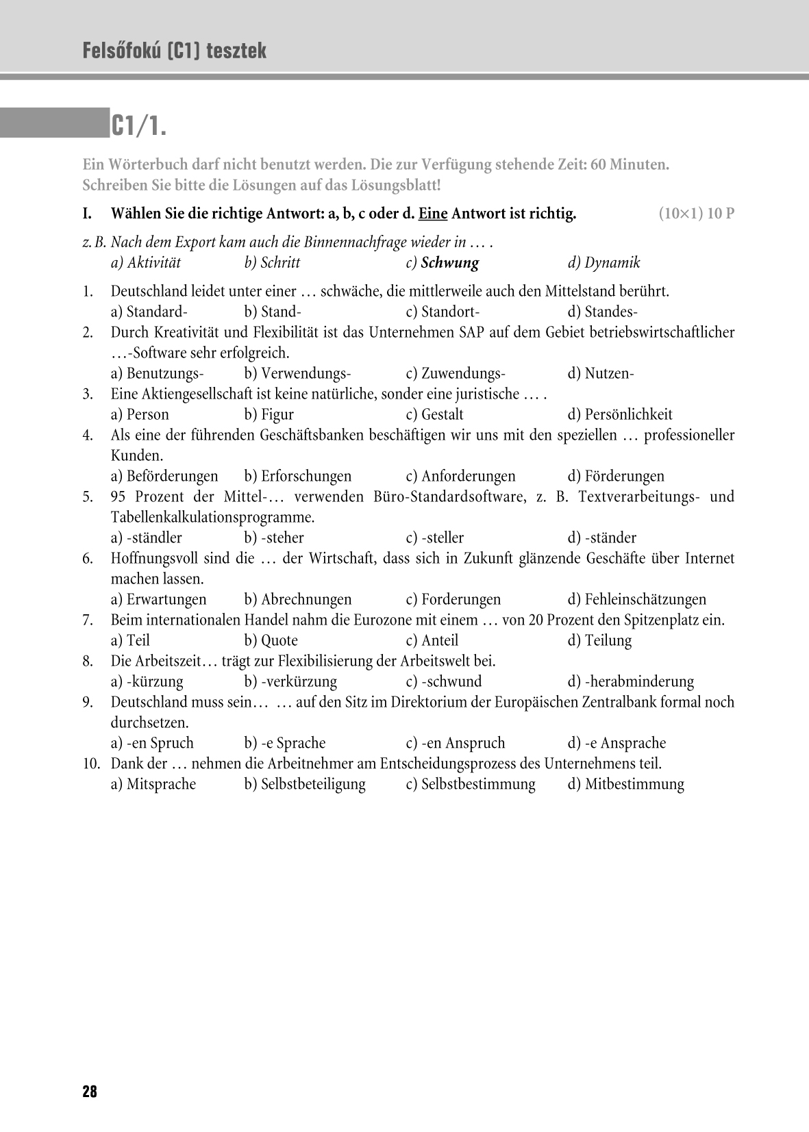 A tesztkönyv közép- és felsÅ‘fokú feladatai megfelelnek a gazdasági szakmai nyelvvizsgák Közös Európai Referenciakeret szerinti B2 és C1 szintjeinek. Mivel szerzÅ‘ink a Budapesti Corvinus Egyetem közgazdasági szaknyelvi vizsgarendszerének gyakorló és gyakorlott vizsgáztatói, illetve vizsgaanyag fejlesztÅ‘i, e feladatokat több éves oktatói és vizsgáztatói tapasztalatuk felhasználásával állÃtották össze. A tesztek nemcsak szerkezetükben, de nehézségi szintjükben is pontosan megegyeznek azokkal a feladatokkal, melyek az OECONOM Ãrásbeli vizsga szaknyelvismereti tesztjét alkotják, szókincsük igazodik az OECONOM nyelvvizsga közgazdasági témaköreihez.