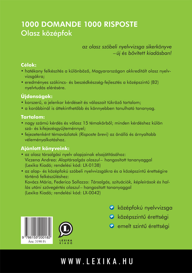 Kovács Mária, Federico Sollazzo: Társalgás, szituációk, képleÃrások és hallás utáni szövegértés olaszul – hangosÃtott tananyaggal (Lexika Kiadó; rendelési kód: LX-0042)