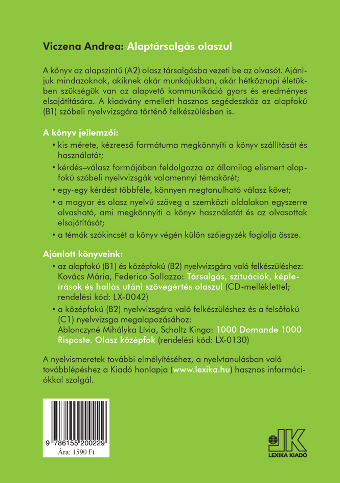 A könyv az alapszintű (A2) olasz társalgásba vezeti be az olvasót. Ajánljuk mindazoknak, akiknek akár munkájukban, akár hétköznapi életükben szükségük van az alapvetÅ‘ kommunikáció gyors és eredményes elsajátÃtására. A kiadvány emellett hasznos segédeszköz az alapfokú (B1) szóbeli nyelvvizsgára történÅ‘ felkészülésben is.