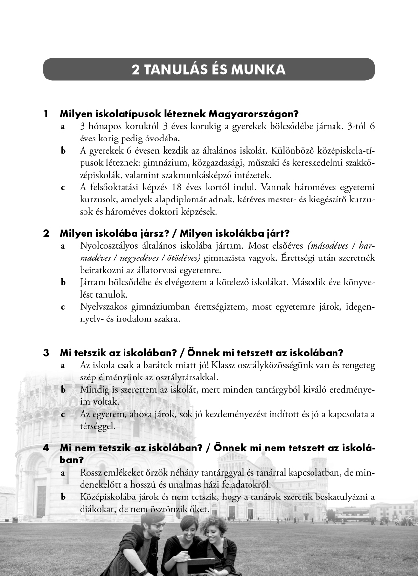 • kérdés–válasz formájában feldolgozza az államilag elismert alapfokú szóbeli nyelvvizsgák valamennyi témakörét;
