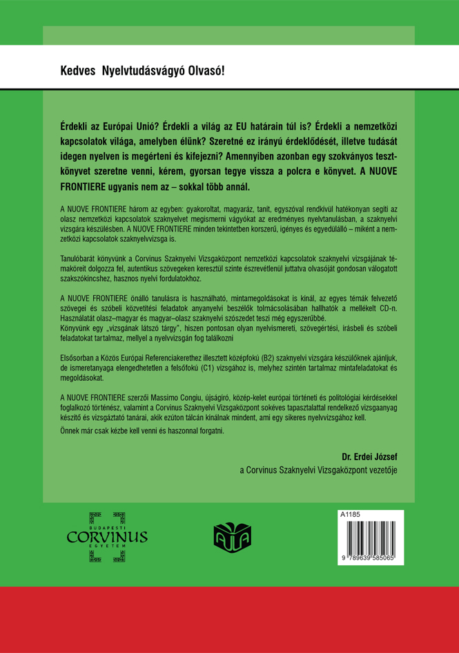 A NUOVE FRONTIERE három az egyben: gyakoroltat, magyaráz, tanÃt, egyszóval rendkÃvül hatékonyan segÃti az olasz nemzetközi kapcsolatok szaknyelvet megismerni vágyókat az eredményes nyelvtanulásban, a szaknyelvi vizsgára készülésben. A NUOVE FRONTIERE minden tekintetben korszerű, igényes és egyedülálló - miként a nemzetközi kapcsolatok szaknyelvvizsga is.