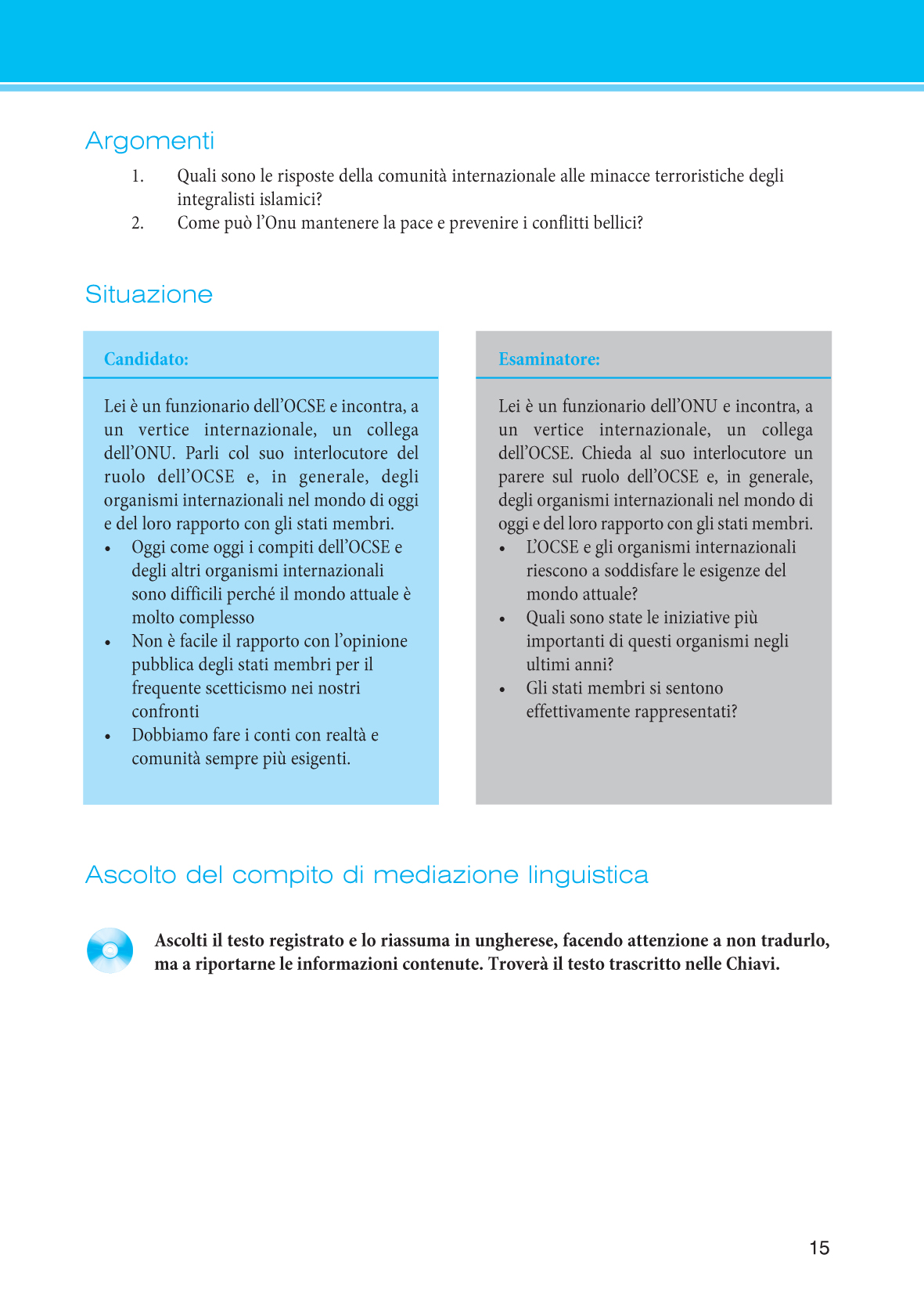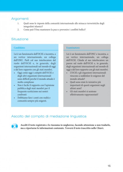 A NUOVE FRONTIERE önálló tanulásra is használható, mintamegoldásokat is kÃnál, az egyes témák felvezetÅ‘ szövegei és szóbeli közvetÃtési feladatok anyanyelvi beszélÅ‘k tolmácsolásában hallhatók a mellékelt CD-n. Használatát olasz-magyar és magyar-olasz szaknyelvi szószedet teszi még egyszerűbbé. Könyvünk egy "vizsgának látszó tárgy", hiszen pontosan olyan nyelvismereti, szövegértési, Ãrásbeli és szóbeli feladatokat tartalmaz, mellyel a nyelvvizsgán fog találkozni