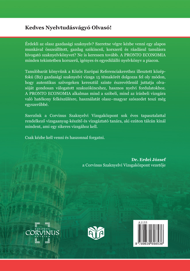 Érdekli az olasz gazdasági szaknyelv? Szeretne végre kézbe venni egy alapos munkával összeállÃtott, gazdag szókincsű, korszerű és ráadásul tanulásra hÃvogató szaknyelvkönyvet? Ne is keressen tovább. A PRONTO ECONOMIA minden tekintetben korszerű, igényes és egyedülálló nyelvkönyv a piacon.