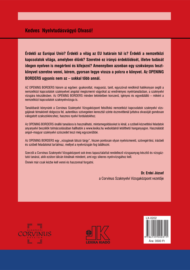 AZ OPENING BORDERS három az egyben: gyakoroltat, magyaráz, tanÃt, egyszóval rendkÃvül hatékonyan segÃti a nemzetközi kapcsolatok szaknyelvet angolul megismerni vágyókat az eredményes nyelvtanulásban, a szaknyelvi vizsgára készülésben. Az OPENING BORDERS minden tekintetben korszerű, igényes és egyedülálló - miként a nemzetközi kapcsolatok szaknyelvvizsga is.