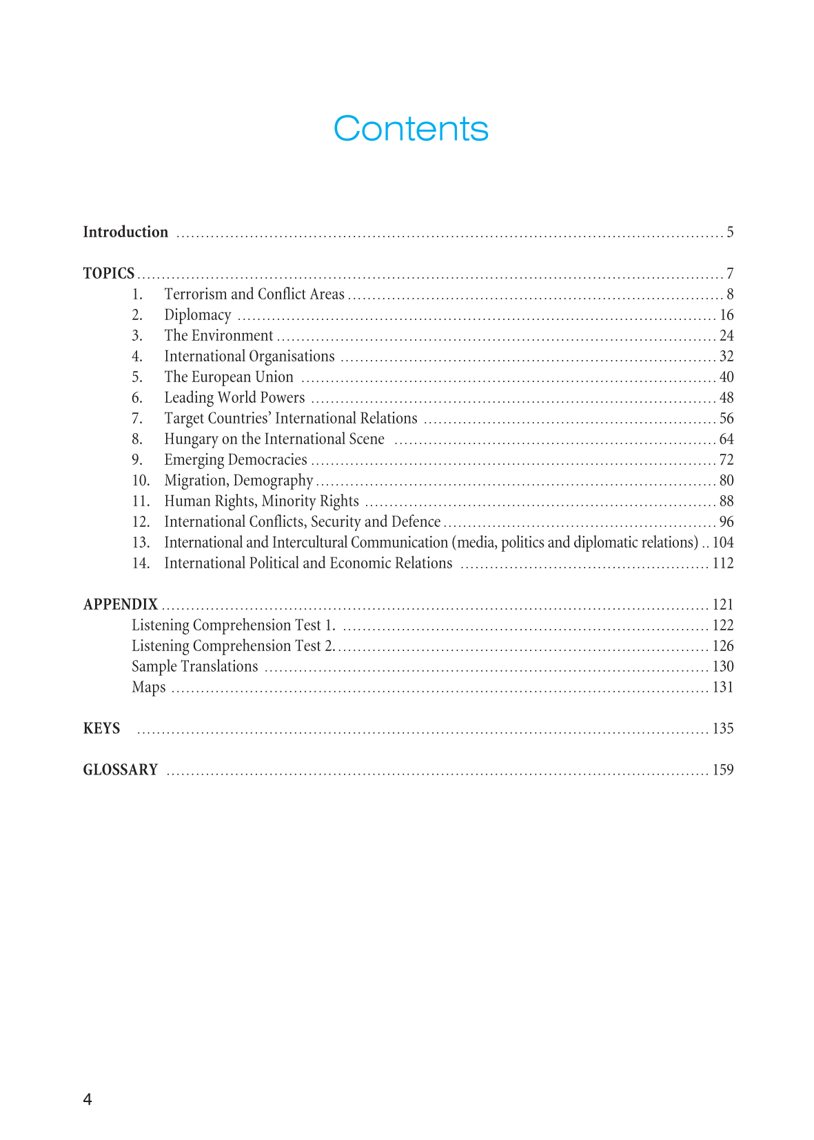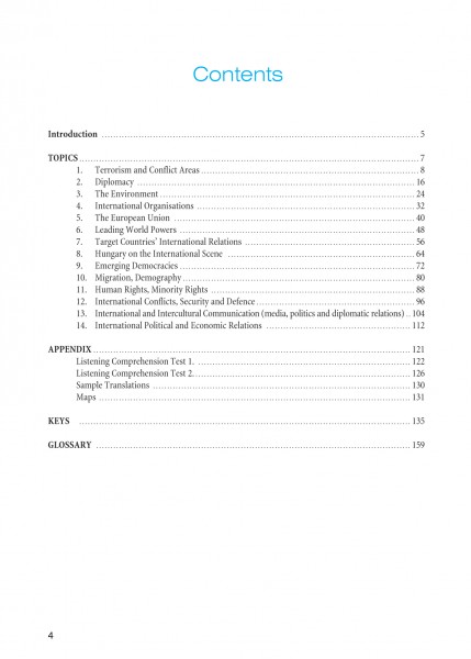 Tanulóbarát könyvünk a Corvinus Szaknyelvi Vizsgaközpont felsőfokú nemzetközi kapcsolatok szaknyelvi vizsgájának témaköreit dolgozza fel, autentikus szövegeken keresztül szinte észrevétlenül juttatva olvasóját gondosan válogatott szakszókincshez, hasznos nyelvi fordulatokhoz.