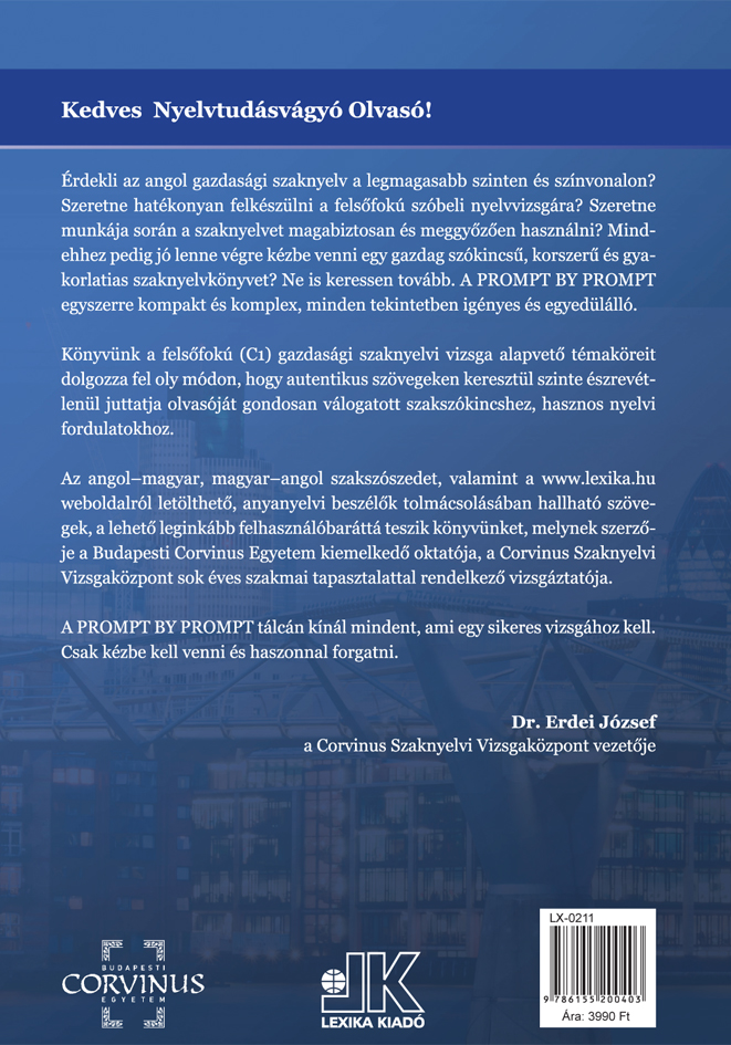 Az angol-magyar, magyar-angol szakszószedet, valamint a www.lexika.hu weboldalról letölthető, anyanyelvi beszélők tolmácsolásában hallható szövegek, a lehető leginkább felhasználóbaráttá teszik könyvünket, melynek szerzője a Budapesti Corvinus Egyetem kiemelkedő oktatója, a Corvinus Szaknyelvi Vizsgaközpont sok éves szakmai tapasztalattal rendelkező vizsgáztatója.