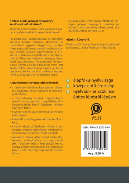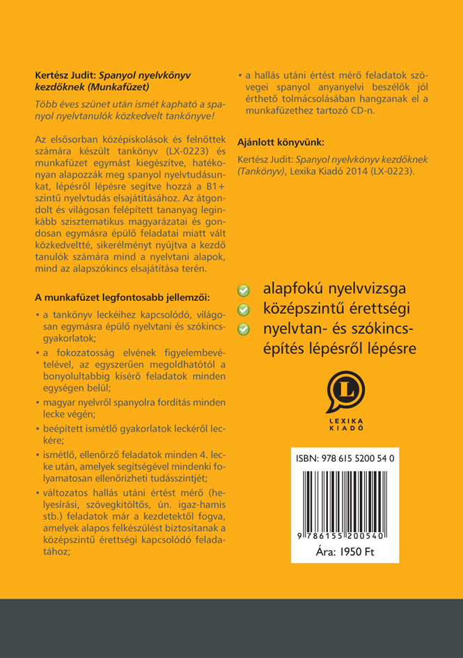 Az elsÅ‘sorban középiskolások és felnÅ‘ttek számára készült tankönyv (LX-0223) és munkafüzet egymást kiegészÃtve, hatékonyan alapozzák meg spanyol nyelvtudásunkat, lépésrÅ‘l lépésre segÃtve hozzá a B1+ szintű nyelvtudás elsajátÃtásához. Az átgondolt és világosan felépÃtett tananyag leginkább szisztematikus magyarázatai és gondosan egymásra épülÅ‘ feladatai miatt vált közkedveltté, sikerélményt nyújtva a kezdÅ‘ tanulók számára mind a nyelvtani alapok, mind az alapszókincs elsajátÃtása terén.