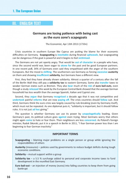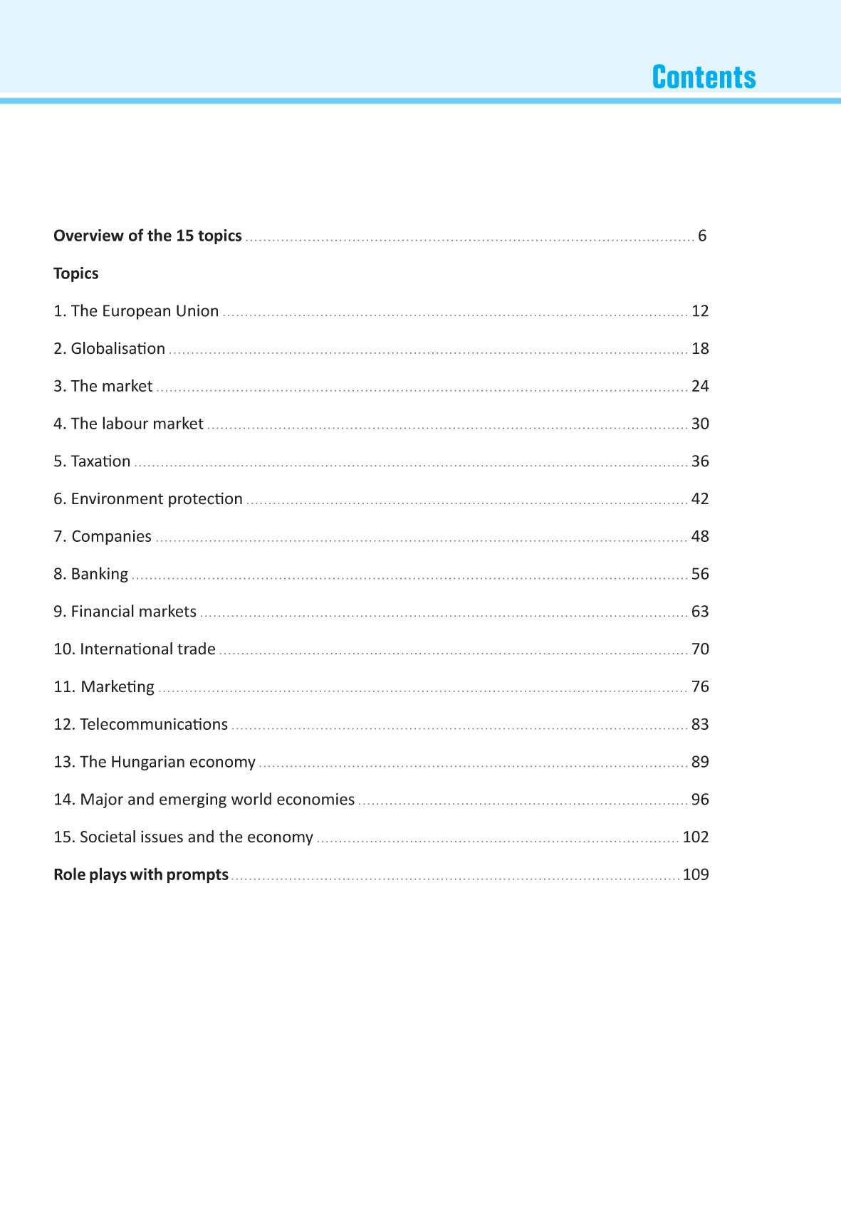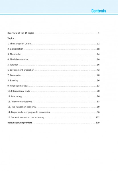 - a középfokú (B2) gazdasági szaknyelvi vizsga mind a 15 témakörének feldolgozása egy-egy fejezetben;