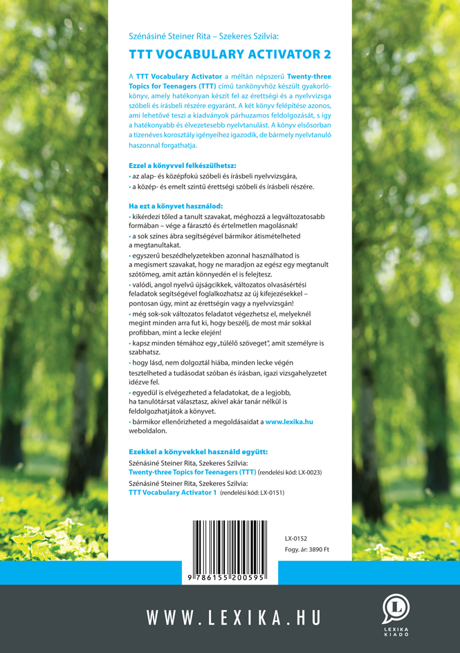 A TTT Vocabulary Activator a méltán népszerű Twenty-three Topics for Teenagers (TTT) cÃmű tankönyvhöz készült gyakorlókönyv, amely hatékonyan készÃt fel az érettségi és a nyelvvizsga