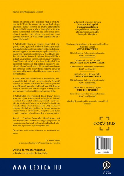 A WELTPASS egy "vizsgának látszó tárgy", hiszen pontosan olyan nyelvismereti, szövegértési, Ãrásbeli és szóbeli feladatokat tartalmaz, mellyel a nyelvvizsgán fog találkozni. ElsÅ‘sorban a Közös Európai Referenciakerethez illesztett középfokú (B2) szaknyelvi vizsgára készülÅ‘knek ajánljuk, de ismeretanyaga elengedhetetlen a felsÅ‘fokú (C1) vizsgához is, melyhez szintén tartalmaz mintafeladatokat és megoldásokat.